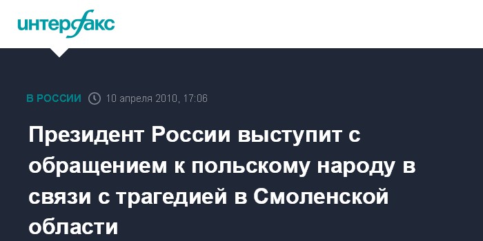 Москва. 10 апреля. INTERFAX.RU - В ближайшее время президент РФ выступит с обращением к польскому народу в связи с трагедией в Смоленской области, сообщила пресс-секретарь президента РФ Наталья Тимакова.