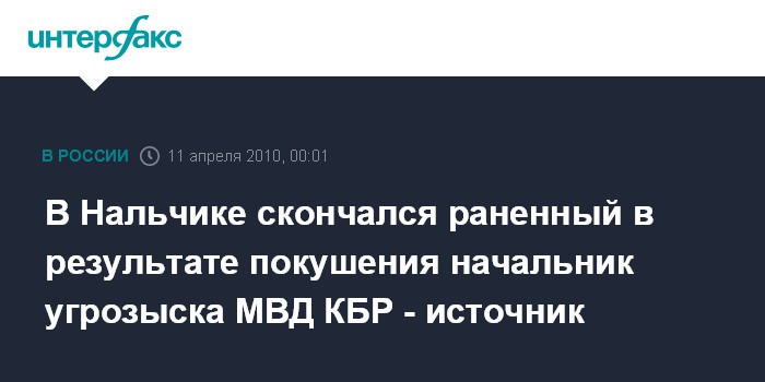 Нальчик. 11 апреля. ИНТЕРФАКС-ЮГ - Начальник Управления уголовного розыска МВД по Кабардино-Балкарии полковник Зубер Шукаев скончался в Нальчике в реанимации Республиканской клинической больницы после покушения, совершенного в субботу вечером, сообщил агентству "Интерфакс-Юг" источник в правоохранительных органах КБР.