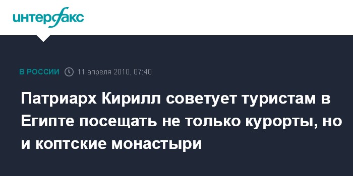 Александрия. 11 апреля. ИНТЕРФАКС - Патриарх Московский и всея Руси Кирилл надеется на рост интереса со стороны туристов, ежегодно приезжающих в Египет на отдых, к древним христианским традициям этой страны.