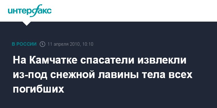 Петропавловск-Камчатский. 11 апреля. INTERFAX.RU - В 18.20 по камчатскому времени в аэропорт "Авачинский" будут доставлены тела еще шестерых человек, погибших под снежной лавиной. Как сообщил агентству "Интерфакс-Дальний Восток" министр специальных программ Камчатского края Сергей Хабаров, из-под снега извлечены тела всех погибших людей, поисковая операция, длившаяся почти сутки на месте схода снежной лавины, завершилась. Последними из-под лавины извлекли тела гида фирмы "Дилижанс" Павла Малюги и туриста из Германии Андрея Науменко, имеющего двойное гражданство