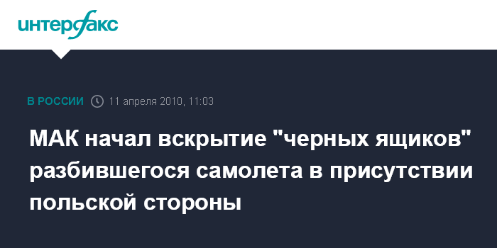 Москва. 11 апреля. INTERFAX.RU - Межгосударственный авиационный комитет (МАК) приступил к вскрытию бортовых самописцев разбившегося самолета Ту-154 М президента Польши, сообщает пресс-служба министерства транспорта РФ. "Речевой и параметрический самописцы доставлены в специальную лабораторию МАК, где в присутствии польской стороны, в том числе представителей прокуратуры Польши, а также Следственного комитета при прокуратуре РФ, начаты работы по их вскрытию", - отметили в пресс-службе.