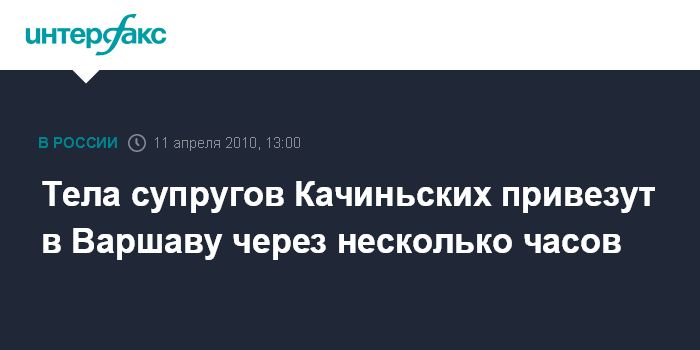 Варшава. 11 апреля. INTERFAX.RU - Останки президента Польши Леха Качиньского и его жены Марии будут доставлены в Варшаву в воскресенье, сообщила польская радиостанция "Тройка". "Перед погрузкой в самолет погибшим президенту и его жене будут отданы воинские почести. Затем их тела погрузят на военный самолет", - отмечается в сообщении радиостанции. По данным "Тройки", самолет с телами приземлится в Варшаве около 14:00 по местному времени (16:00 МСК).