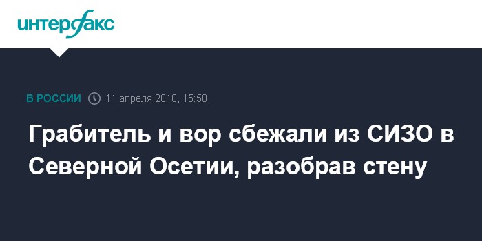 Владикавказ. 11 апреля. INTERFAX.RU - В городе Моздок (Северная Осетия) совершили побег из изолятора временного содержания УВД двое задержанных, сообщили агентству "Интерфакс-Юг" в правоохранительных органах Северной Осетии. "В субботу вечером, разобрав кирпичную стену в умывальной, преодолев двор и оградительную стену, двое заключенных скрылись. Один из них был задержан за грабеж, другой - за кражу", - сказал собеседник агентства. По его словам, в настоящее время принимаются меры по розыску и задержанию беглецов, а также проводится служебная проверка.