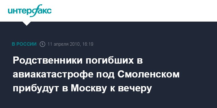 Москва. 11 апреля. INTERFAX.RU - Самолет с родственниками погибших в авиакатастрофе под Смоленском прибудет в Москву примерно в восемь вечера, сообщил журналистам в воскресенье первый заместитель мэра в правительстве Москвы Петр Бирюков. "В 16:35 мск из Польши вылетит самолет с родственниками погибших, который прибудет в один из аэропортов Москвы ориентировочно в 20:05. Родственники примут участие в опознании", - сказал П.Бирюков. По его словам, проблем с размещением родственников, а также специалистов, нет.
