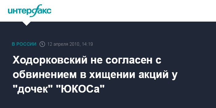 Москва. 12 апреля. INTERFAX.RU - Экс-глава НК "ЮКОС" Михаил Ходорковский опроверг обвинение в свой адрес по факту хищений акций дочерних предприятий компании.