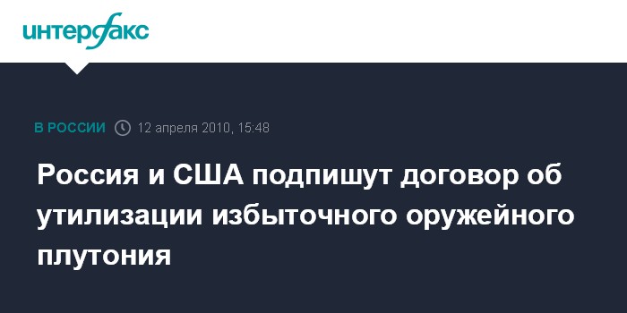 Москва. 12 апреля. INTERFAX.RU - Россия и США подпишут двусторонний документ об утилизации избыточного оружейного плутония 13 апреля в Вашингтоне, сообщил замглавы МИД РФ Сергей Рябков.