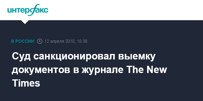 Москва. 12 апреля. ИНТЕРФАКС - Тверской суд Москвы принял в понедельник решение об изъятии в редакции журнала The New Times ("Новое время") документов, аудио- и видеозаписей в связи с делом о клевете.