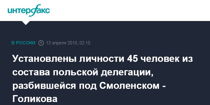 "На данный момент опознано 45 погибших в авиакатастрофе. Среди опознанных - супруга президента Польши", - сказала Т.Голикова.