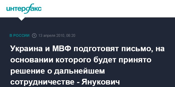"Сегодня состоялись плодотворные переговоры с миссией Международного валютного фонда. Было принято решение подготовить совместно с Международным валютным фондом письмо от имени Украины о возобновлении работы. Мы определили срок - не больше двух недель", - сказал В.Янукович.