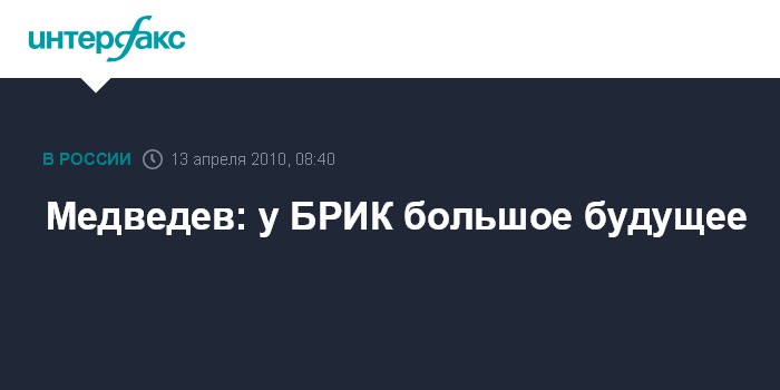 Москва. 13 апреля. INTERFAX.RU - Президент РФ Дмитрий Медведев уверен, что достижения России окажутся востребованными партнерами по БРИК (Россия, Бразилия, Индия, Китай) и взаимодействие в рамках четверки будет укрепляться.