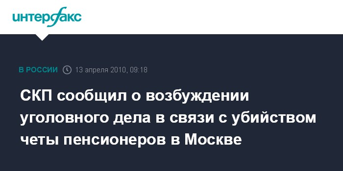 Москва. 13 апреля. INTERFAX.RU - По факту убийства престарелой супружеской пары на севере Москвы возбуждено уголовное дело, сообщил "Интерфаксу" официальный представитель столичного управления СКП РФ Сергей Марченко.