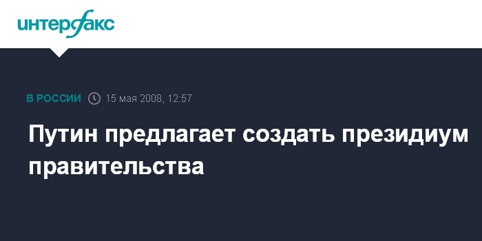 Москва. 15 мая. INTERFAX.RU - Премьер-министр РФ Владимир Путин предлагает создать президиум правительства, куда войдут вице-премьеры.