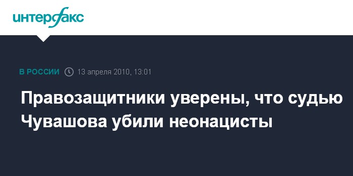 Москва. 13 апреля. INTERFAX.RU - Правозащитники склоняются к версии о том, что убийство в Москве федерального судьи Эдуарда Чувашова могли совершить радикальные националисты. "Это более чем возможно. Эта версия кажется вероятной, учитывая, что национал-радикалы и неонацисты известны попытками убийств своих оппонентов", - сказала во вторник "Интерфаксу" заместитель московского бюро Human Rights Watch Татьяна Локшина.