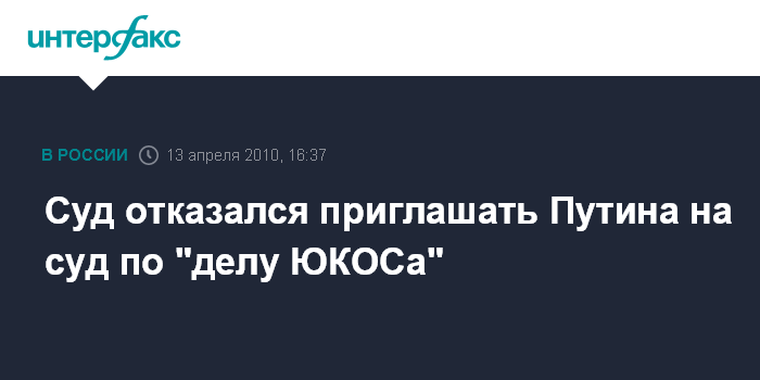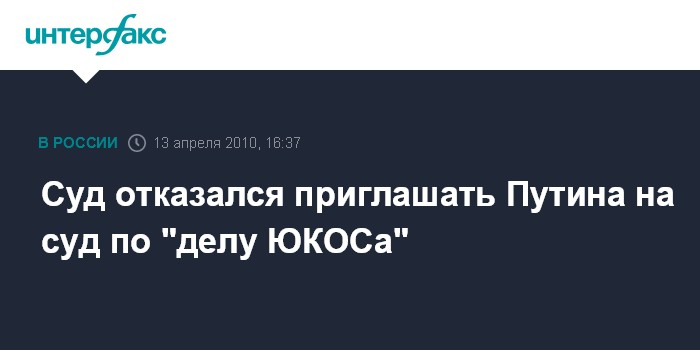 Москва. 13 апреля. INTERFAX.RU - Хамовнический суд отклонил ходатайство защиты экс-главы НК "ЮКОС" (РТС: YUKO) Михаила Ходорковского о вызове в суд для дачи показаний премьер-министра РФ Владимира Путина. "Путин обладает информацией, которая может помочь делу", - сказал адвокат М.Ходорковского Константин Ривкин, аргументируя свое ходатайство. По его словам, Ходорковский, выполняя обязанности главы "ЮКОСа", лично отчитывался перед Путиным.