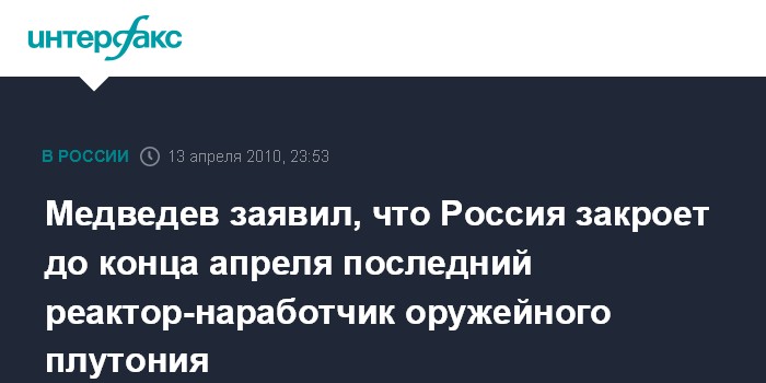 Вашингтон. 13 апреля. ИНТЕРФАКС - Президент РФ Дмитрий Медведев в ходе выступления на саммите по ядерной безопасности объявил о решении России закрыть до конца апреля последний действующий в РФ реактор-наработчик оружейного плутония в городе Железногорске, сообщила журналистам пресс-секретарь президента Наталья Тимакова.
