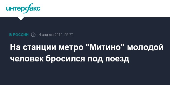 Москва. 14 апреля. INTERFAX.RU - Во вторник вечером на станции "Митино" московского метро молодой человек покончил жизнь самоубийством, бросившись под поезд, сообщил "Интерфаксу" источник в правоохранительных органах города.