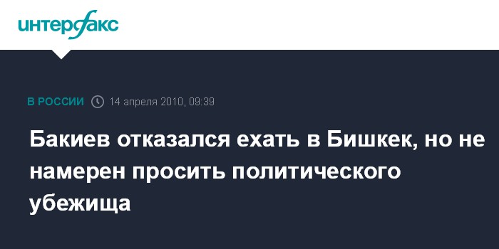 "Новые власти не могут предоставить мне гарантии безопасности, поэтому я не вижу смысла ехать в Бишкек", - заявил Бакиев журналистам в среду. Также он заявил, что не будет просить политического убежища. "Мною такой вопрос (то есть о политическом убежище) не рассматривается", - сказал Бакиев журналистам в Джалал-Абаде, где он находится с 7 апреля.