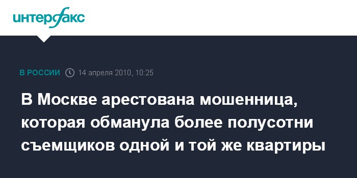 Москва. 14 апреля. INTERFAX.RU - В Москве решением суда арестована жительница района Котловка, которая умудрилась 53 раза "сдать" свою квартиру доверчивым съемщикам, сообщили "Интерфаксу" в пресс-группе УВД Юго-Западного округа столицы в среду.