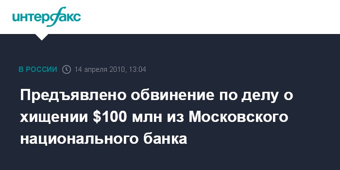 Предъявлено обвинение по делу о хищении $100 млн из Московского национального банка