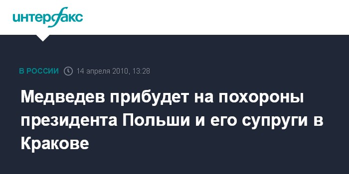 Москва. 14 апреля. INTERFAX.RU - Президент РФ Дмитрий Медведев примет участие в церемонии похорон 18 апреля с.г. в Кракове президента Республики Польша Леха Качиньского и его супруги, трагически погибших в авиакатастрофе под Смоленском 10 апреля 2010 г., сообщила в среду пресс-служба Кремля.