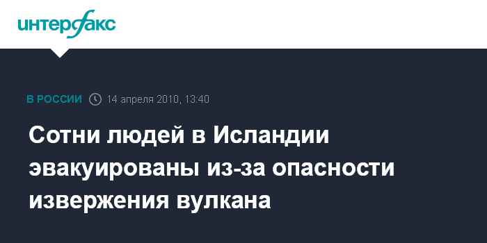 Москва. 14 апреля. INTERFAX.RU - Около 800 человек эвакуированы в среду из-за риска извержения вулкана на юге Исландии, сообщает норвежская телерадиокомпания НРК. Эвакуация проведена из-за высокого риска извержения вулкана на леднике Эяфьеллайокулль. На угрозу извержения указывает большое количество землетрясений в регионе.