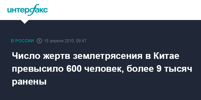Москва. 15 апреля. INTERFAX.RU - Число погибших в результате мощного землетрясения в уезде Юйшу китайской западной провинции Цинхай выросло, по состоянию на 11:00 по местному времени (07:00 мск), до 617 человек.
