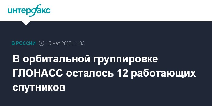 Москва. 15 мая. INTERFAX.RU - Из 16 спутников орбитальной группировки ГЛОНАСС по целевому назначению используется 12, сообщает Информационно-аналитический центр Роскосмоса. В четверг из спутниковой группировки российской навигационной системы на техобслуживание выведен очередной космический аппарат, говорится в сообщении, размещенном на сайте подразделения Роскосмоса.