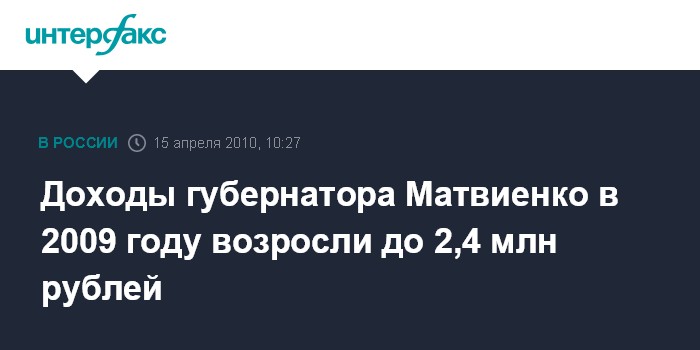 Доходы губернатора Матвиенко в 2009 году возросли до 2,4 млн рублей