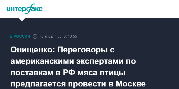 Москва. 15 апреля. INTERFAX.RU - Роспотребнадзор предлагает американским экспертам провести в Москве еще один раунд переговоров по вопросу о возобновлении поставок из США мяса птицы на российский рынок.