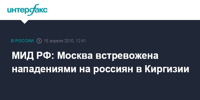 Москва. 15 апреля. INTERFAX.RU - МИД РФ обеспокоен безопасностью российских граждан в Киргизии. "В последние дни в посольство России в Бишкеке поступают многочисленные обращения граждан РФ и российских соотечественников в связи со случаями рейдерских захватов и нападений на офисы их компаний и жилые дома, проявление бытового национализма в Бишкеке и ряде других районов Киргизии", - сказал журналистам в Москве в четверг официальный представитель МИД РФ Андрей Нестеренко.