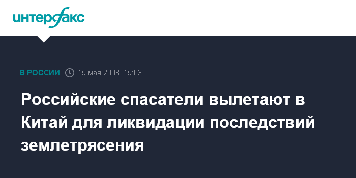 Москва. 15 мая. INTERFAX.RU - Российские спасатели вылетают в Китай для участия в ликвидации последствий разрушительного землетрясения, сообщило Управление информации МЧС России. "Китайская сторона готова принять группу российских спасателей и врачей для участия в поисково-спасательной операции и разборе завалов в пострадавших районах страны. Планируется, что самолет МЧС России Ил-76 вылетит в Китай уже сегодня вечером", - говорится в сообщении.