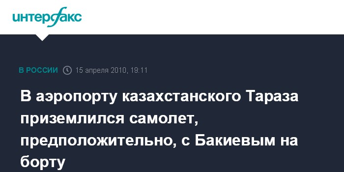Москва. 15 апреля. INTERFAX.RU - В аэропорту Тараза (адмцентр Жамбылской области Казахстана) вечером в четверг совершил посадку военный самолет, сообщил корреспонденту агентства "Интерфакс-Казахстан" источник в руководстве аэропорта. Не исключено, что на борту этого самолета может находиться президент Киргизии Курманбек Бакиев. Однако собеседник агентства в руководстве аэропорта не стал говорить, откуда прилетел самолет и кто может находиться на его борту.