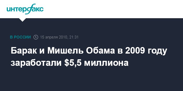 Москва. 15 апреля. INTERFAX.RU - Президент США Барак Обама и первая леди США Мишель Обама в 2009 году заработали $5,5 млн, заплатив в федеральную казну налоги на сумму $1,79 млн, сообщают американские СМИ со ссылкой на заявление администрации Белого дома. Согласно заявлению Белого дома, главной статьей дохода президентского семейства стали продажи книг Б.Обамы, ставших бестселлерами в США.