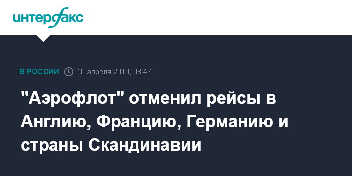 Москва. 16 апреля. INTERFAX.RU - ОАО "Аэрофлот" отменило около 20 рейсов в связи с закрытием воздушного пространства и аэропортов Европы из-за облака пепла, образовавшегося после извержения вулкана в Исландии. Отменены рейсы "Аэрофлота" в Лондон (SU-241 и 243), Париж (SU-249, 251, 259 и 257), Ригу (SU-159), Осло (SU-211), Копенгаген (SU-215), Стокгольм (SU-219), Амстердам (SU-229), Варшаву (SU-101), Берлин (SU-113), Франкфурт (SU-105), Гамбург (SU-125), Дюссельдорф (SU-127 и 117), Мюнхен (SU-121) и Калининград (SU-753).