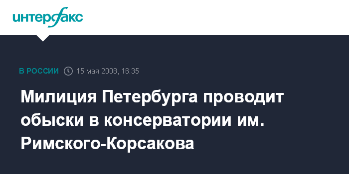 Санкт-Петербург. 15 мая. INTERFAX.RU - Управление по борьбе с экономическими преступлениями ГУВД Петербурга и Ленинградской области проводит обыски в Санкт-Петербургской государственной консерватории имени H.А. Римского-Корсакова.