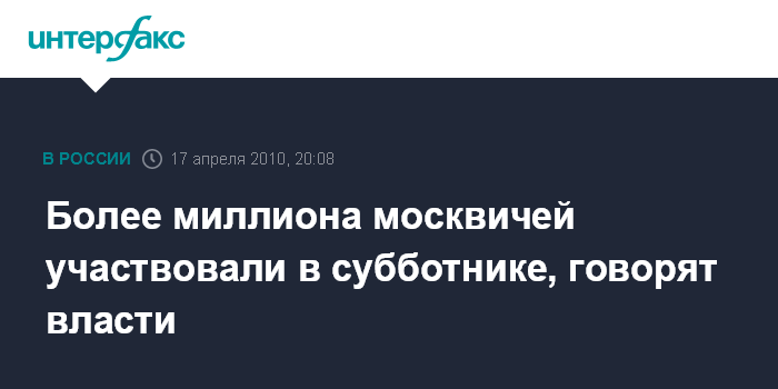 Москва. 17 апреля. ИНТЕРФАКС-МОСКВА - В городском субботнике в Москве, по данным на 19:00, приняли участие 1 млн 100 тыс. человек, сообщил "Интерфаксу" источник в комплексе городского хозяйства.