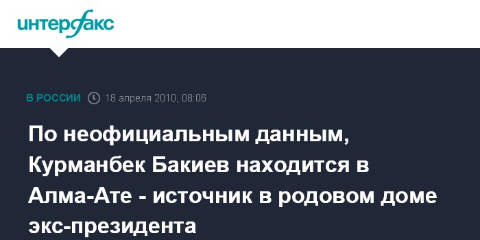 Тейит (Джалал-Абадская область). 18 апреля. ИНТЕРФАКС - Бывший президент Киргизии Курманбек Бакиев, подписавший 16 апреля заявление об отставке, согласно неофициальным данным, находится в Алма-Ате.