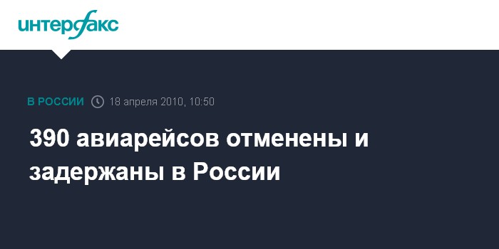 Москва. 18 апреля. INTERFAX.RU - Авиакомпании из-за извержения исландского вулкана отменили и задержали 388 рейсов в десяти российских аэропортах, сообщили "Интерфаксу" в Росавиации в воскресенье утром. В ведомстве отметили, что по состоянию на 9:00 утра на этих рейсах должны были улететь 31 984 пассажира.