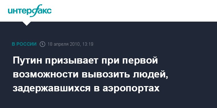 "Ситуация меняется, тем не менее, и некоторые европейские столицы открываются, поэтому "Аэрофлот" и другие наши компании должны самым оперативным образом реагировать на изменение ситуации и при первой же возможности вывозить людей", - заявил Путин на совещании, посвященном ситуации с авиаперевозками в связи с извержением вулкана в Исландии.