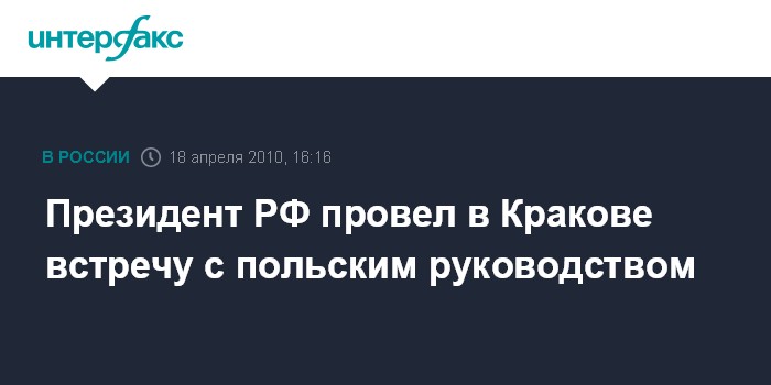 Краков. 18 апреля. INTERFAX.RU - Президент России Дмитрий Медведев встретился в воскресенье в Кракове с и.о. президента Польши Брониславом Коморовским. Открывая встречу, глава российского государства еще раз выразил соболезнования родным и близким погибших, всему польскому народу, сообщила пресс-секретарь президента РФ Наталья Тимакова.