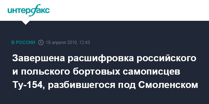 Москва. 19 апреля. INTERFAX.RU - Специалисты завершили расшифровку бортовых самописцев российского и польского производства Ту-154, разбившегося под Смоленском, сообщили "Интерфаксу" в межгосударственном авиационном комитете в понедельник. "Расшифрован обнаруженный на месте авиапроисшествия эксплуатационный бортовой самописец российского производства. Считанная с него информация используется дополнительно совместно с информацией, полученный с аварийного параметрического регистратора", - отметили в МАК.