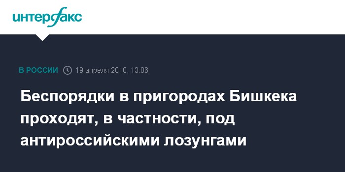 Москва. 19 апреля. INTERFAX.RU - Попытки самовольного захвата земли и имущества под Бишкеком проходят, в числе прочего, под антироссийскими и антирусскими лозунгами. "Есть некоторые данные о том, что присутствуют некие антирусские, антироссийские лозунги", - сообщил в понедельник "Интерфаксу" пресс-атташе посольства РФ в Киргизии Виктор Харченко.