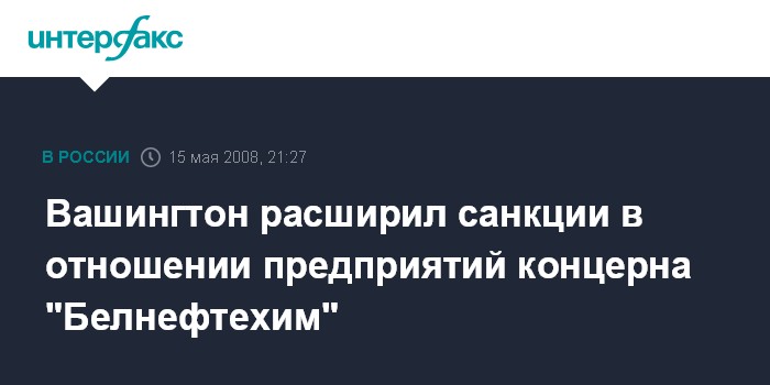 Минск. 15 мая. ИНТЕРФАКС-ЗАПАД - Соединенные Штаты Америки расширили экономические санкции в отношении предприятий, входящих в концерн "Белнефтехим".