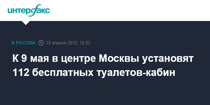 Москва. 19 апреля. INTERFAX.RU - Для зрителей и участников Парада Победы в этом году в центре Москвы будут установлены 112 бесплатных туалетов-кабин, сообщил в интервью "Интерфаксу" руководитель ГУ ГЗ "Сантехработ" Сергей Федосов. "Также нельзя забывать, что на самой Красной площади и в Александровском саду находятся четыре стационарных бесплатных общественных туалета первой категории, т.е. самого высокого класса во всем городе", - рассказал Федосов. Он подчеркнул, что организация и установка на местах туалетов является одной из важнейших задач для предприятия каждый год.