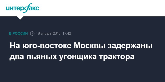 Москва. 19 апреля. INTERFAX.RU - В Москве поймали двух молодых людей, которые угнали трактор отдела эксплуатации парка "Кузьминки-Люблино", сообщили "Интерфаксу" в пресс-группе УВД Юго-Восточного округа столицы в понедельник.