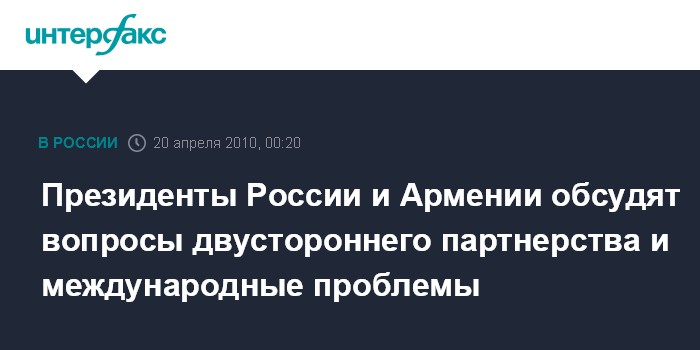 Как сообщил "Интерфаксу" источник в Кремле, в ходе переговоров будет рассмотрен ряд актуальных вопросов российско-армянского союзнического партнерства. "Его неизменно конструктивный характер задается регулярным доверительным политическим диалогом. Состоявшиеся в 2009-2010 годах контакты президентов России и Армении, в том числе в ходе рабочих визитов С.Саргсяна в Российскую Федерацию (в апреле и октябре 2009 года и январе 2010 года), в рамках многосторонних мероприятий, подтвердили обоюдную заинтересованность в дальнейшем углублении российско-армянского сотрудничества", - сказал источник.