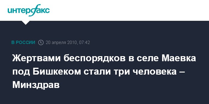 Бишкек. 20 апреля. ИНТЕРФАКС - В результате беспорядков в селе Маевка под Бишкеком в понедельник погибли три человека, 28 получили ранения, сообщили "Интерфаксу" во вторник в пресс-службе министерства здравоохранения Киргизии.