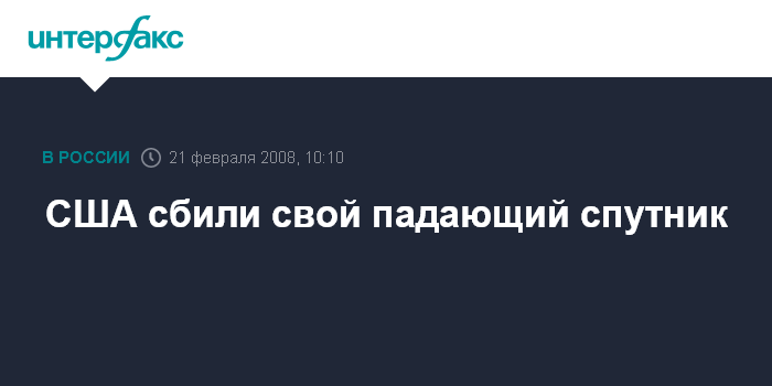 Москва. 21 февраля. INTERFAX.RU - Американский спутник-шпион, сошедший с орбиты в конце прошлого года с тех пор постепенно падавший на Землю, был в среду сбит тактической ракетой, которую ВВС США запустили с крейсера Lake Erie из района в Тихом океане западнее Гавайев. Как передает CNN со ссылкой на официальный Пентагон, операция прошла успешно. Ракета стартовала вчера в 10:30 по местному времени и уничтожила спутник, находившийся на высоте 247 км над поверхностью планеты. В заявлении Минобороны США уточняется, что военной боеголовки на ракете не было. В идеале она должна была попасть точно в топливный бак спутника, где находилось 450 кг топлива, однако пока военные не могут сказать наверняка, удалось ли им это сделать.