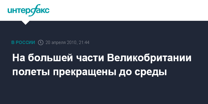 Во вторник лишь несколько авиалайнеров смогли вылететь из британских аэропортов, воздушное пространство на большей части территории королевства останется закрытым до 1:00 британского времени (4:00 мск) среды.