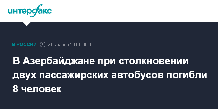 Москва. 21 апреля. INTERFAX.RU - Восемь человек погибли, 11 ранены в результате столкновения двух пассажирских автобусов в Товузском районе Азербайджана, сообщили в среду агентству "Интерфакс-Азербайджан" в МВД республики.